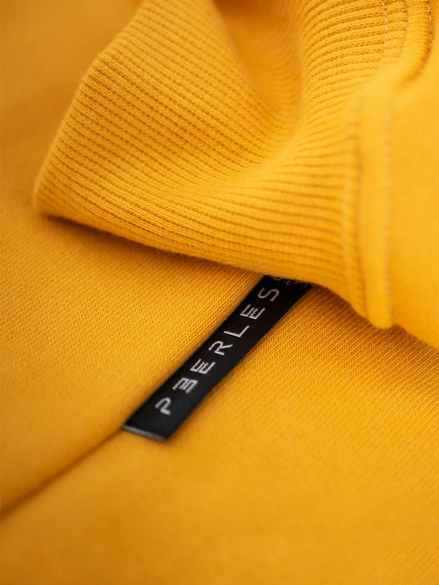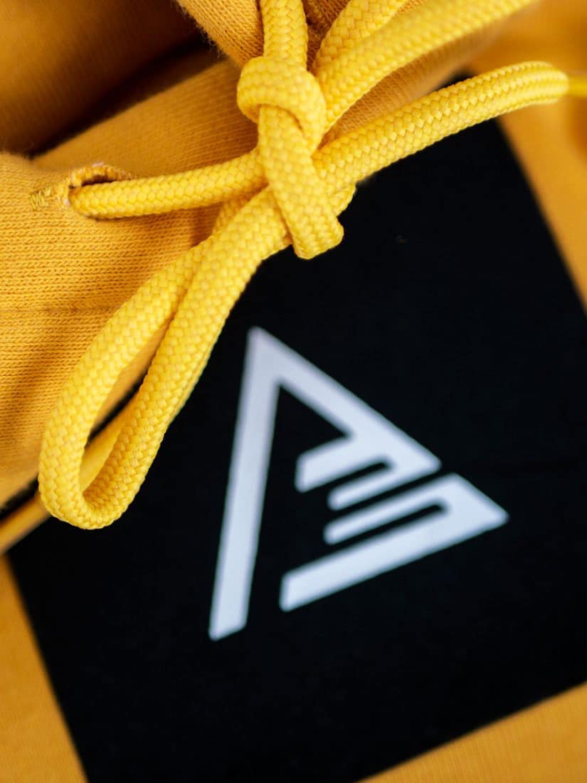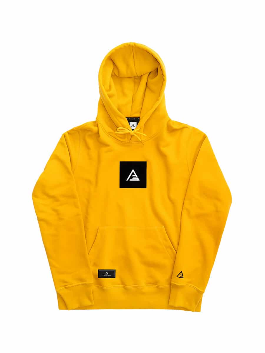Żółta bawełniana bluza z kapturem o gramaturze 290g/m2 z nadrukiem Box Logo na klatce piersiowej.