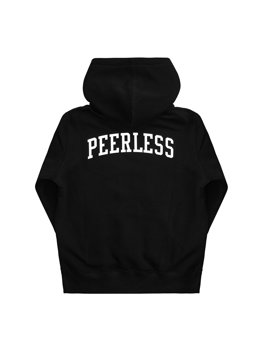 Na plecach duża aplikacja z napisem Peerless (niezrównany) w stylu „college”.